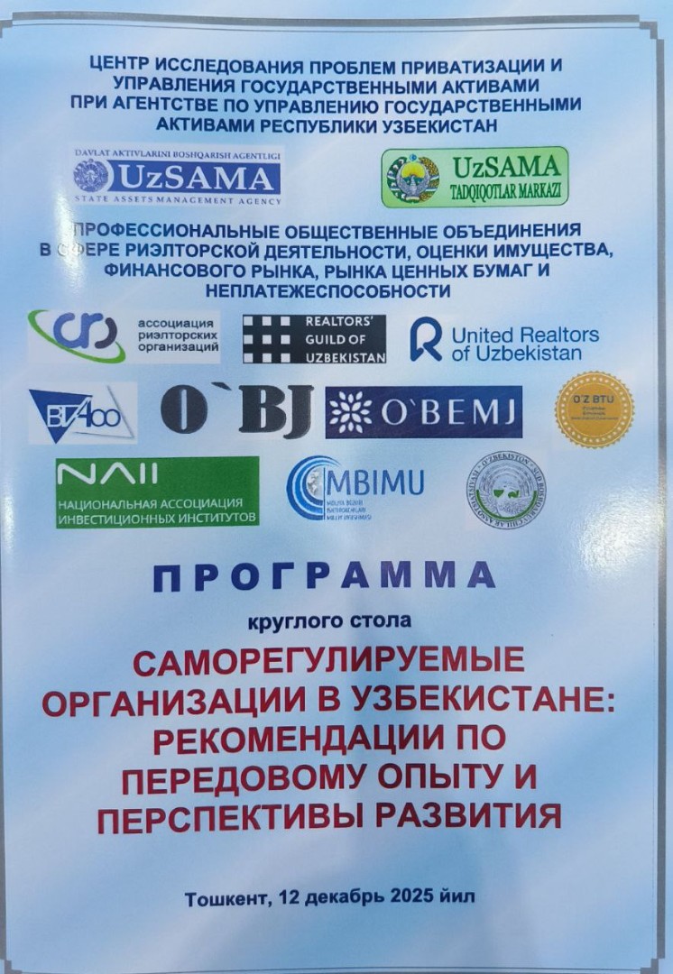 12 декабря 2025 года в городе Ташкенте состоялся круглый стол на тему «Саморегулируемые организации в Узбекистане: рекомендации по передовому опыту и перспективы развития», организованный Центром исследования проблем приватизации и управления государственными активами при Агентстве по управлению государственными активами Республики Узбекистан.